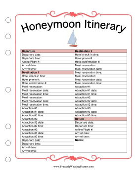 Fill in dates and times for your vacation departure, arrival, reservations, attractions, entertainment and meals in this Wedding Planner Honeymoon Itinerary that includes two destinations.